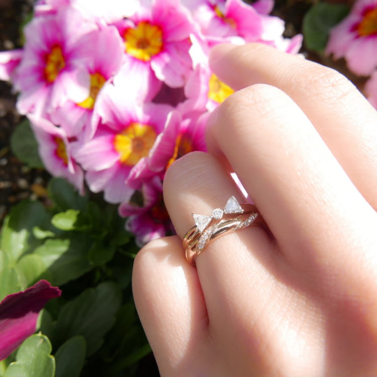 たんぽぽの花言葉は「真心の愛」「幸福」。双子のたんぽぽをリボンモチーフにし、ペアリングは巻き付いたリボンで二人の絆を象徴しています。