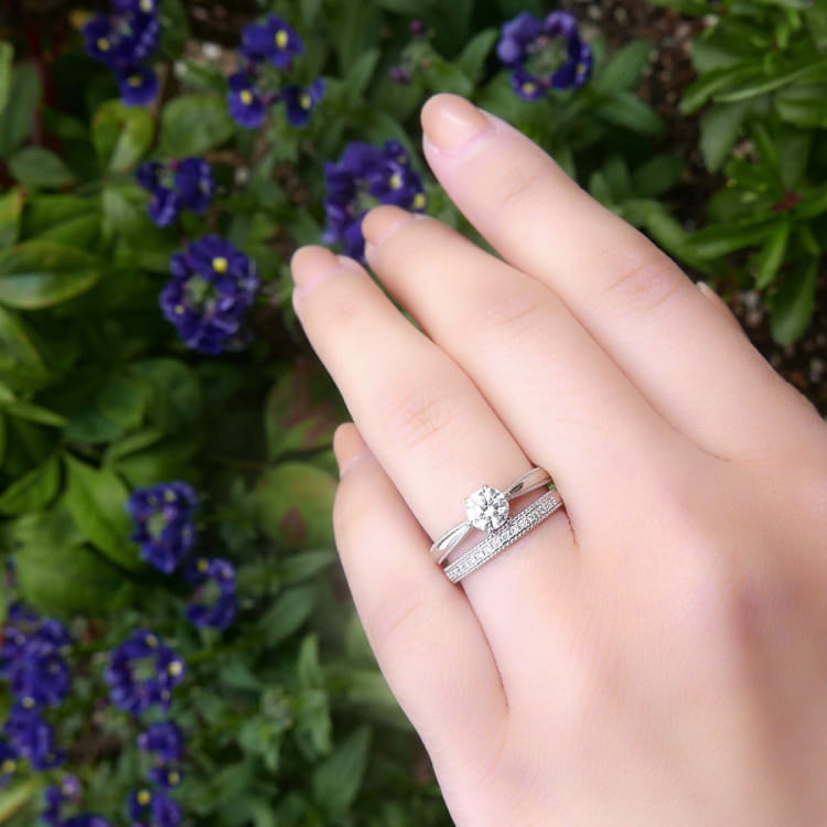 きらめくしずくをモチーフに、伝統的なミル打ちを施しました。水辺の蔓草(つるくさ)がダイヤモンドを包み込む、 やわらかな愛を表現。